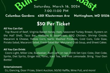 Join us for a night of fun, food and entertainment to celebrate our 30th Anniversary! Where: Columbus Gardens 4301 Klosterman Ave Nottingham, MD 21236 All you can eat: Top Round of Beef, Virginia Baked Honey Ham, Seasoned Turkey Breast, Oysters on the Half Shell, Taco Bar, Kielbasa & Sauerkraut, BBQ Read more…